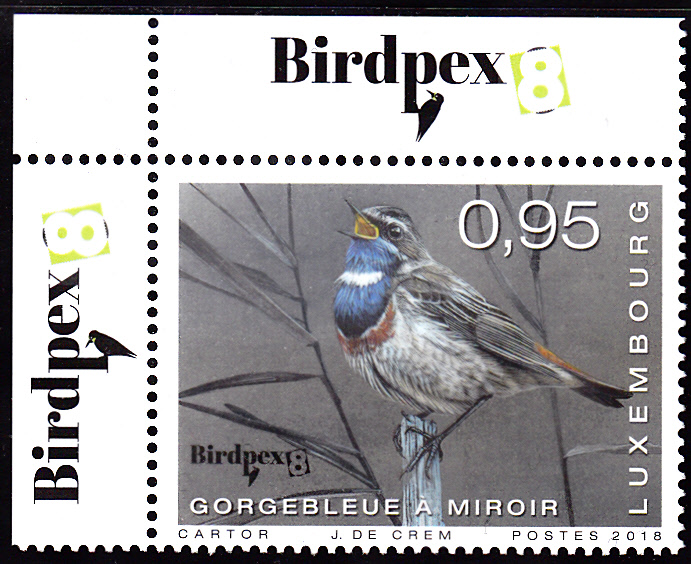 Zur Ausstellung Birdpex 8 gab es in Luxemburg auch eine Marke (MiNr 2170) mit einem Weißstern-Blaukehlchen (Luscinia svecica cyanecula).