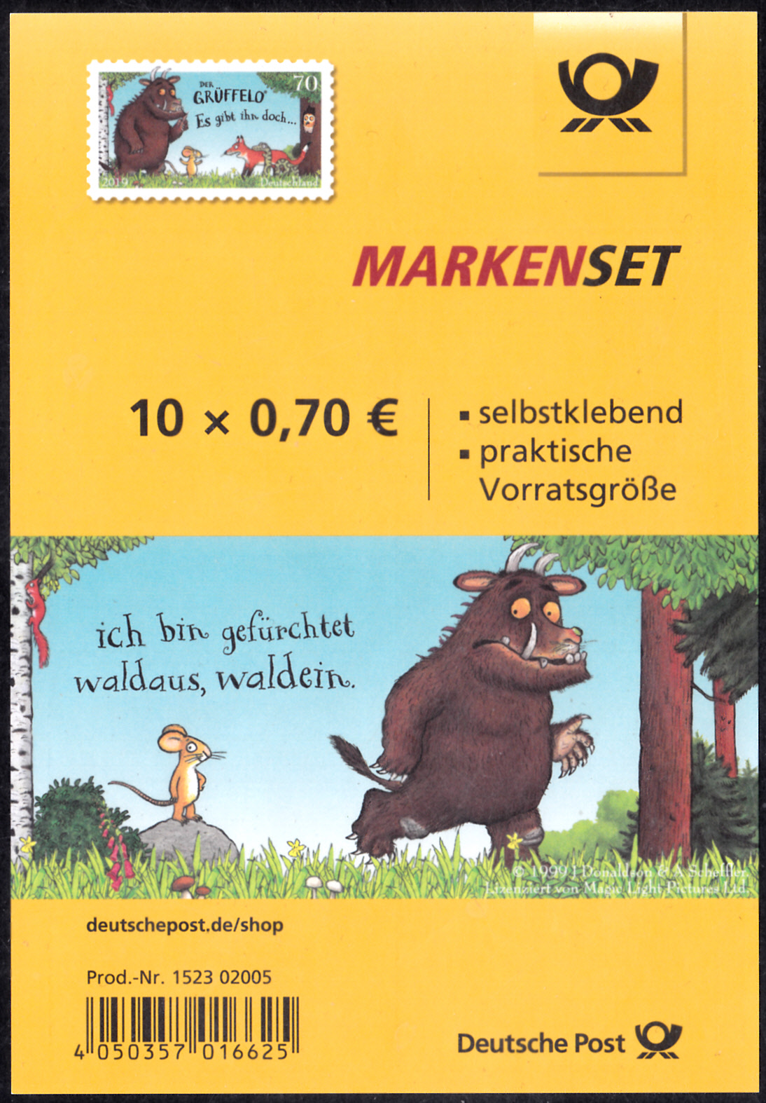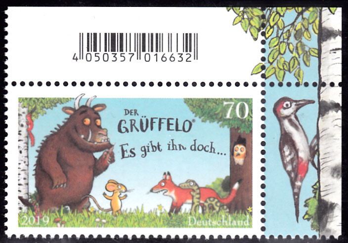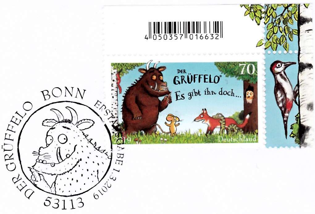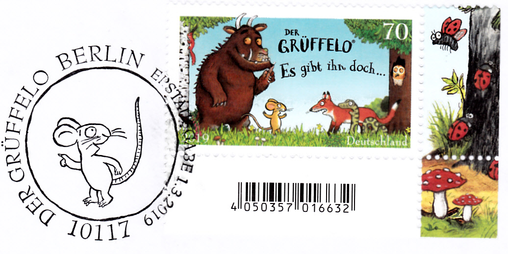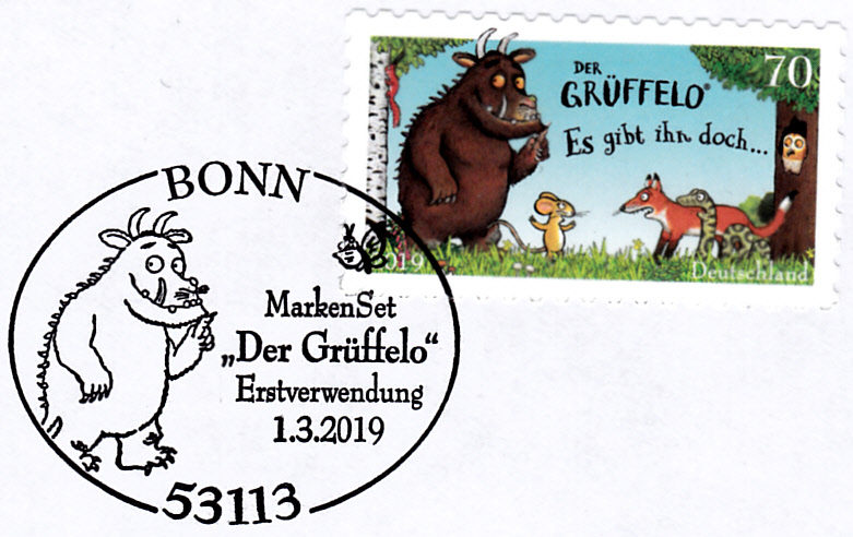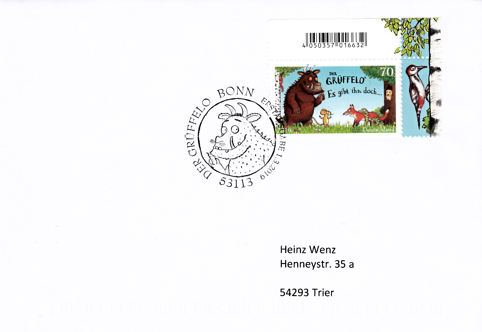 In Deutschland erschien 2019 diese Sondermarke zum Thema "Grüffelo", hier als portorichtige Einzelfrankatur auf einem aktuell bei mir eingegangenen Bedarfsbrief: