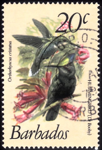 Diese Marke aus Barbados (MiNr 471) zeigt uns zwei Antillenhaubenkolibri (Orthorhyncus cristatus).