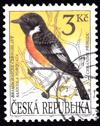 Hier eine Marke aus Belgien (MiNr 2449) mit einem Schwarzkehlchen (Saxicola rubicola). Bei Michel wird als Name angegeben: Schwarzkehlchen (Saxicola torquata). Das ist heute falsch, dieser lateinische Name steht seit 2002 nur für das Afrikanische Schwarzkehlchen (Saxicola torquatus).