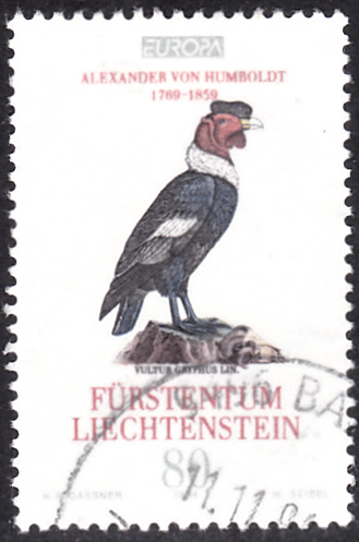 In Liechtenstein erschienen die Europamarken 1994 zum Gemeinschaftsthema "Entdeckungen und Erfindungen" am 7.März 1994. Hier der Wert zu 80 Rappen mit der Abbildung eines kolorierten Kupferstichs mit einem Andenkondor (Vultur gryphus) aus den Werken von Alexander von Humboldt (1769-1859, deutscher Naturforscher und Geograph). Die Auflage dieser Marke betrug 770 594 Stück.
