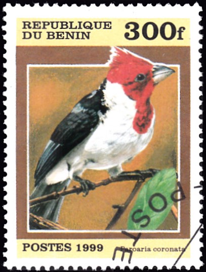 Diese Marke aus Benin (MiNr 1123) zeigt uns einen Graukardinal (Paroaria coronata).