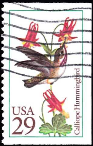 Aus den USA kommt diese Marke (MiNr 2250) zeigt eine Sternelfe (Selasphorus calliope). Bei Michel heißt der Vogel Calliope-Kolibri (Stellula calliope). Es erfolgt dort noch die bis 2012 übliche Zuordnung zur Gattung Stellula.