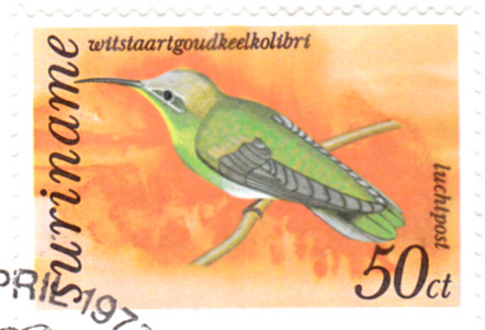 Auf einer Marke aus Surinam (MiNr 766) ist ein Weißschwanz-Goldkehlchen (Polytmus guainumbi) abgebildet.