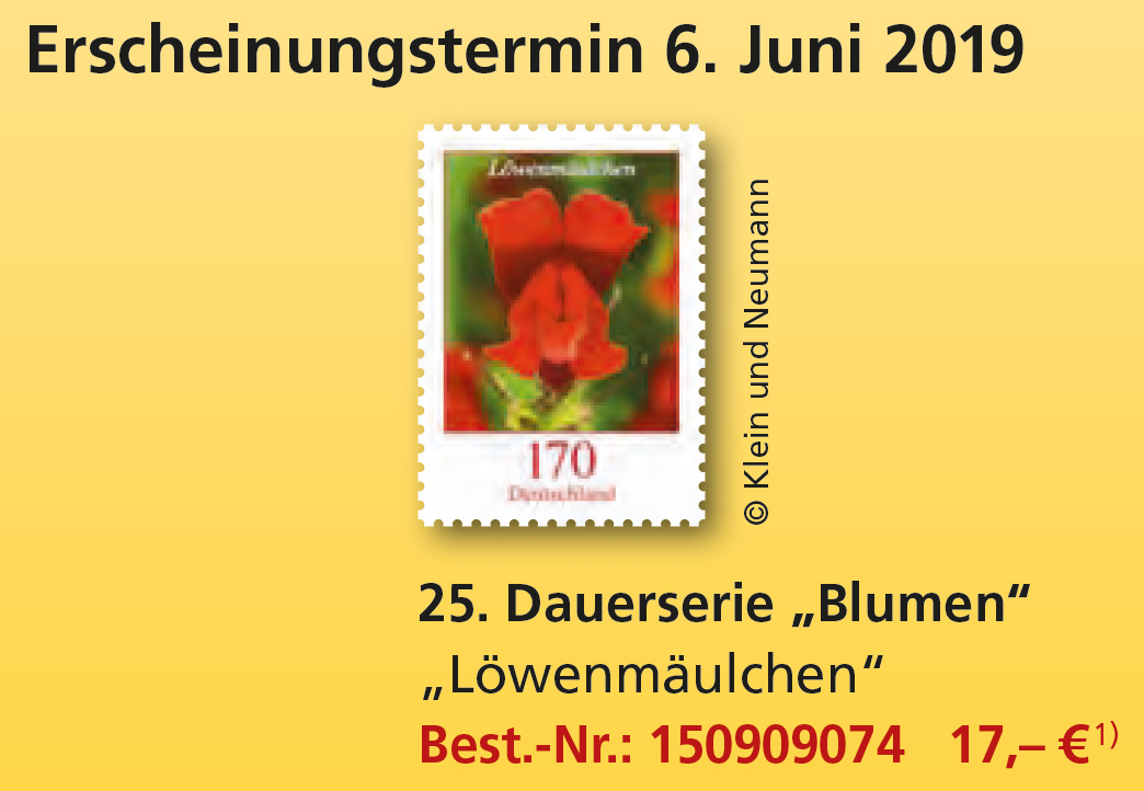 Des Weiteren erscheint am 04.04.2019 das Markenset „Phlox“mit 10 selbstklebenden Postwertzeichen zu je 5 ct (Quelle: https://shop.deutschepost.de/MEDIA/PROD ... 3.2019.PDF, Seite 8)