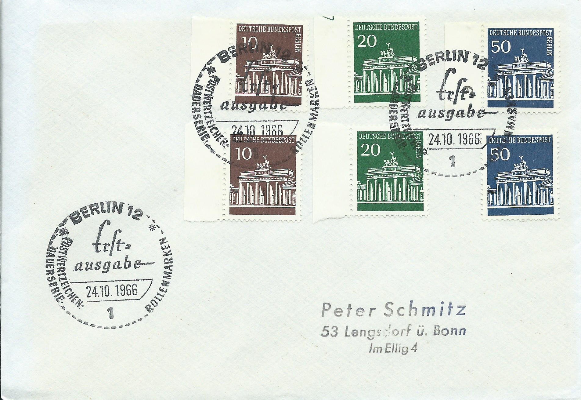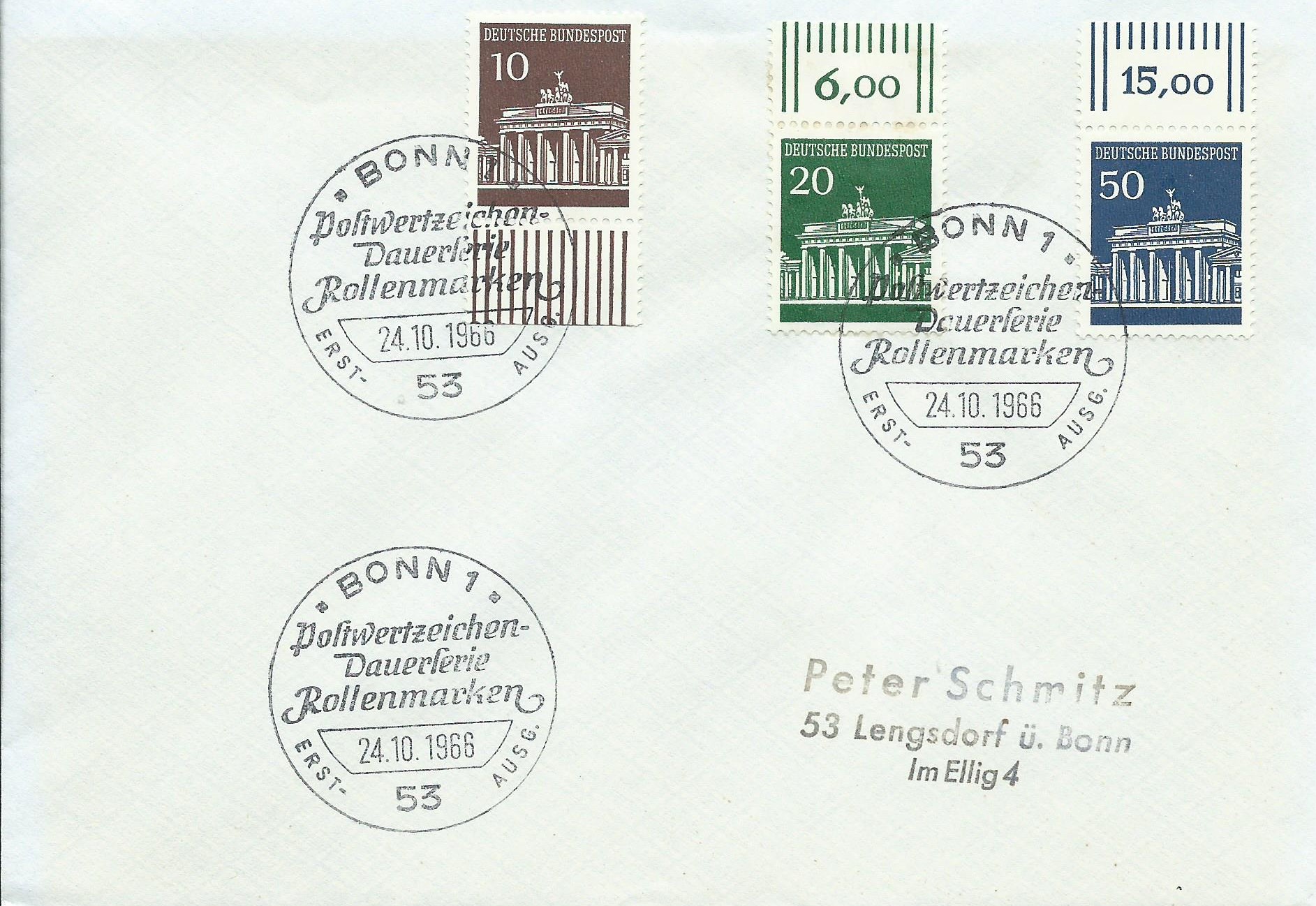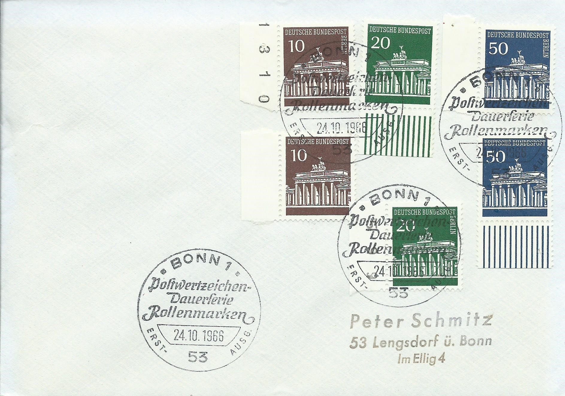 Hier ist ein wenig Gewusel auf dem Beleg: Die 3 Ausgaben Berlin sind vom linken Seitenrand, die Marke Bund zu 10 Pf ebenfalls vom linken Seitenrand und die Marken zu 20 und 50 Pf sind vom Unterrand. Gestempelt wurde mit dem Ersttagssonderstempel Bonn am 24.10.66: