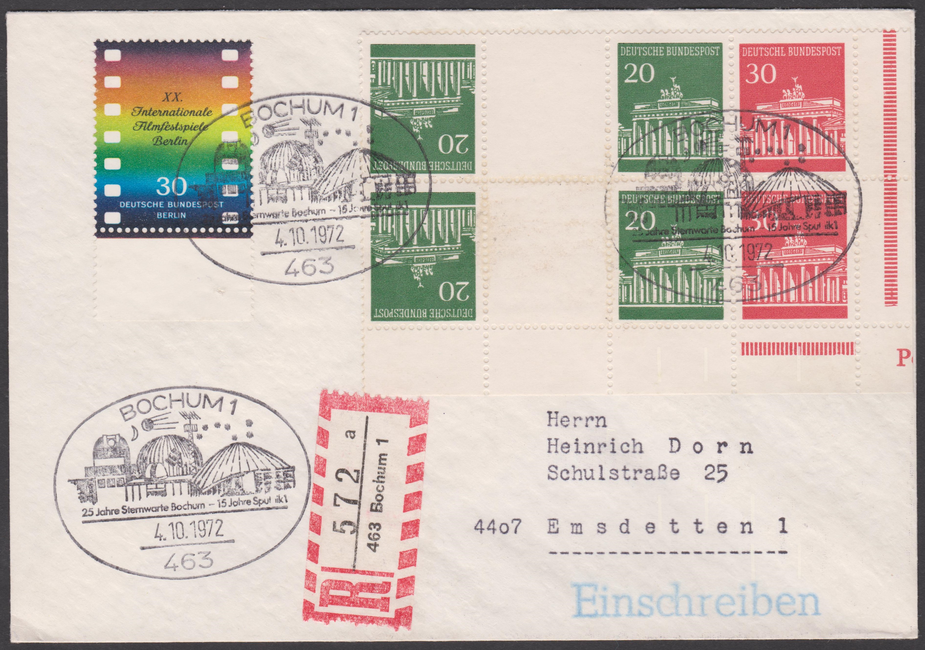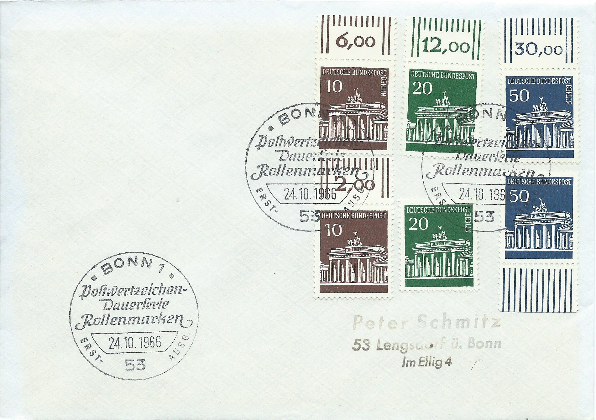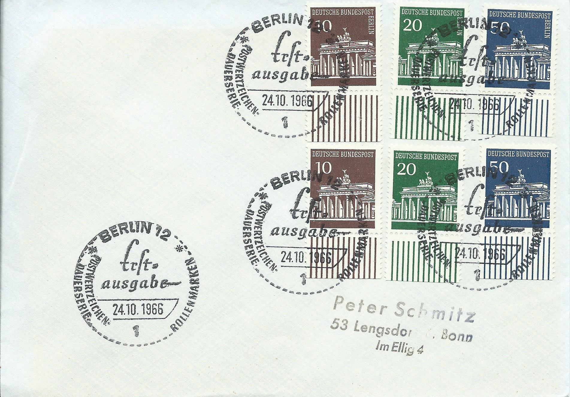 Hier ist ein wenig Gewusel auf dem Beleg: Die 3 Ausgaben Berlin sind vom linken Seitenrand, die Marke Bund zu 10 Pf ebenfalls vom linken Seitenrand und die Marken zu 20 und 50 Pf sind vom Unterrand. Gestempelt wurde mit dem Ersttagssonderstempel Bonn am 24.10.66: