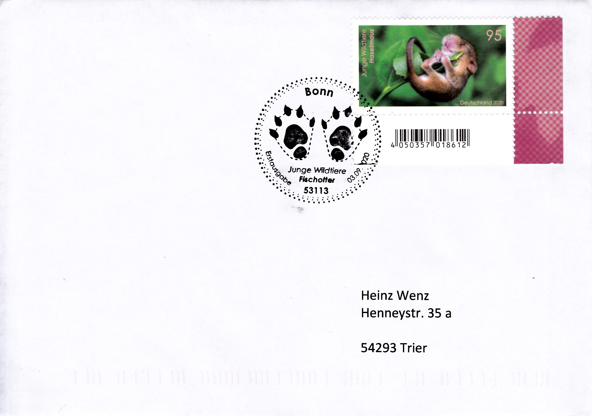 Brief mit dieser Marke mit der Haselmaus und mit dem Ersttagsonderstempel Bonn. Der Stempel zeigt die "Fußspuren" einer Haselmaus und passt so gut zum Markenbild dieser Marke.