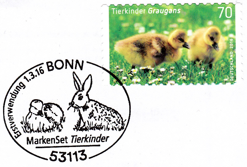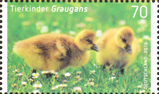 Bei der Deutschen Post AG erschien am 1.3.2016 eine Marke (MiNr 3218) mit der Abbildung von zwei Graugansküken.