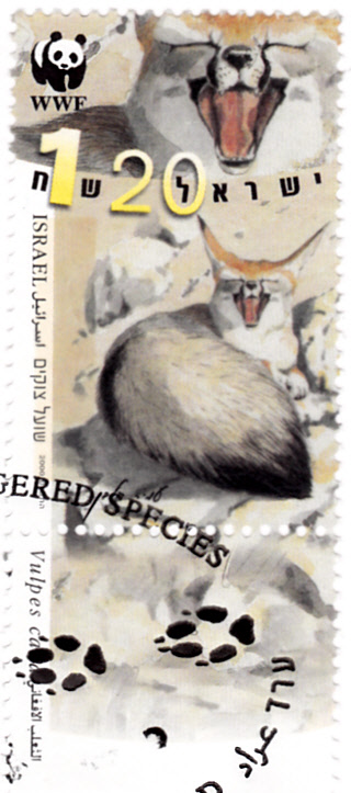 In einer Serie "Weltweiter Naturschutz" aus Israel ist diese Marke (MiNr 1555) mit einem Afghanfuchs (Vulpes cana) auf einem Felden erschienen.