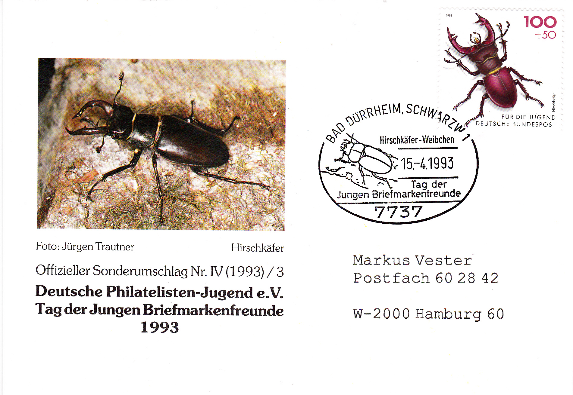 Die Jugendmarke mit dem Hirschkäfer-Männchen wurde hier auf einem Brief am 15.4.1993, dem Ausgabetag der Marke, mit einem Sonderstempel aus Bad Dürrheim zum Tag der Jungen Briefmarkenfreunde gestempelt. Das Stempelbild zeigt ein Hirschkäfer-Weibchen.