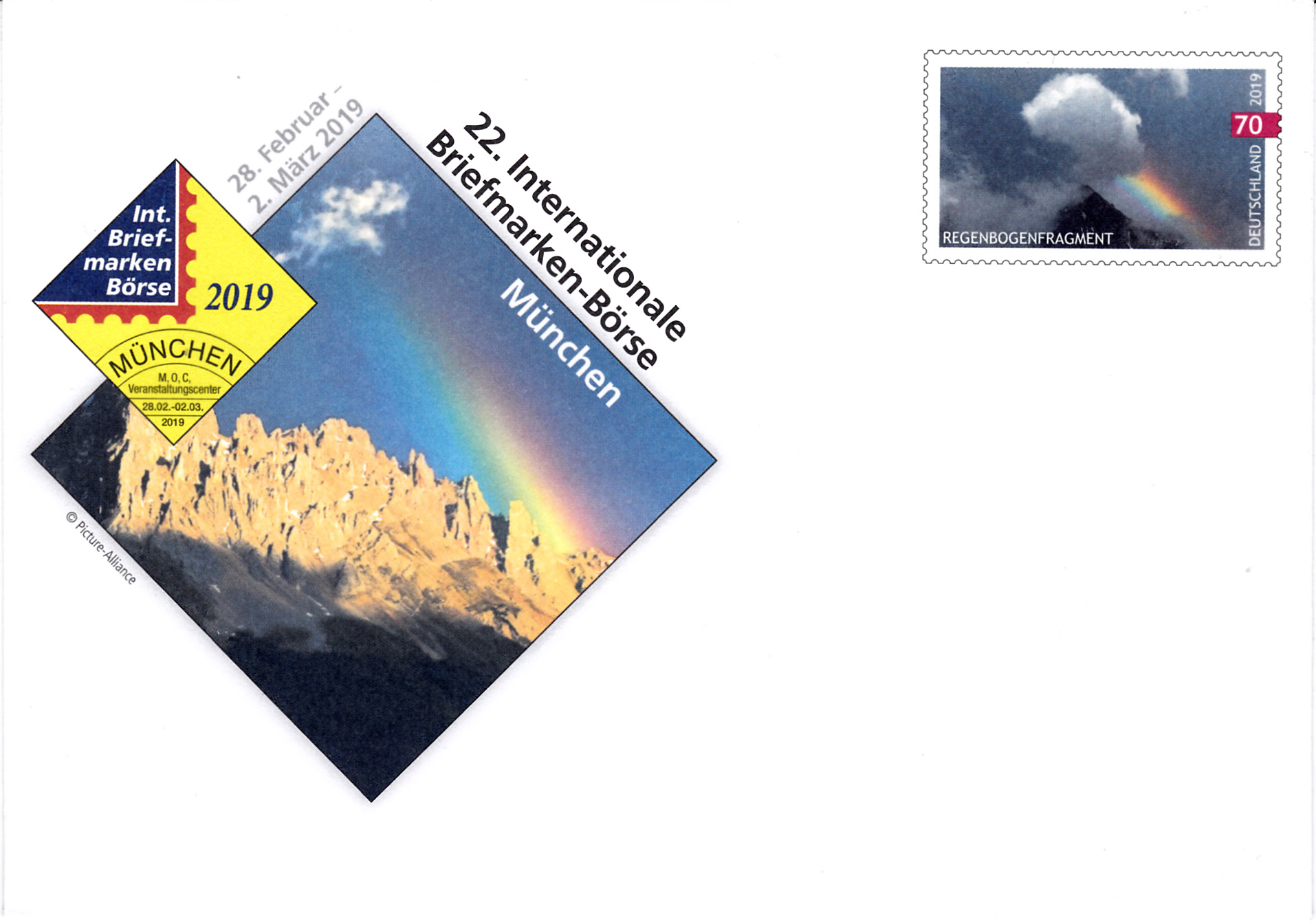 Zur Briefmarken-Börse in München ist ein Sonderumschlag erschienen mit dem Wertstempel "Regenbogen" aus der Serie "Himmelsereignisse" (MiNr 3545).