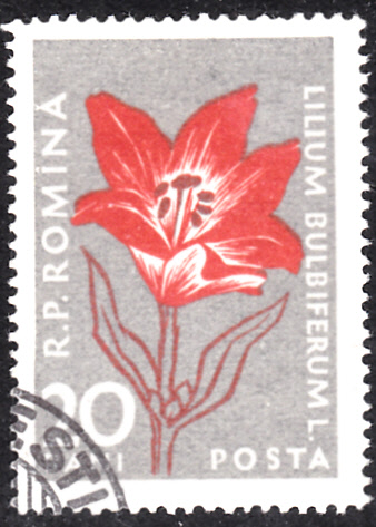 Auf einer Marke der Serie "Flora der Karpaten" aus Rumänien (MiNr 1649) sehen wir eine Feuer-Lilie (Lilium bulbiferum).