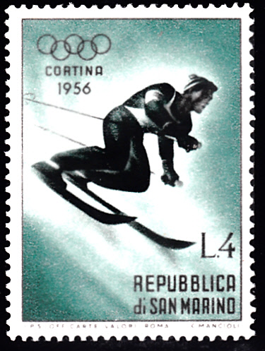 In San Marino ist zu den Spielen in Cortina d'Ampezzo eine Markenserie erschienen. Hier die Marke zu 1 Lira (MiNr 535) mit einem Eisschnellläufer.