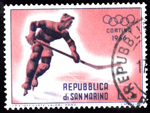 In San Marino ist zu den Spielen in Cortina d'Ampezzo eine Markenserie erschienen. Hier die Marke zu 1 Lira (MiNr 535) mit einem Eisschnellläufer.