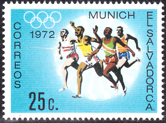 Es folgt eine Marke zu den Olympischen Spielen 1972 in München aus El Salvador (MiNr 1077) mit Läufer beim Zieleionlauf.