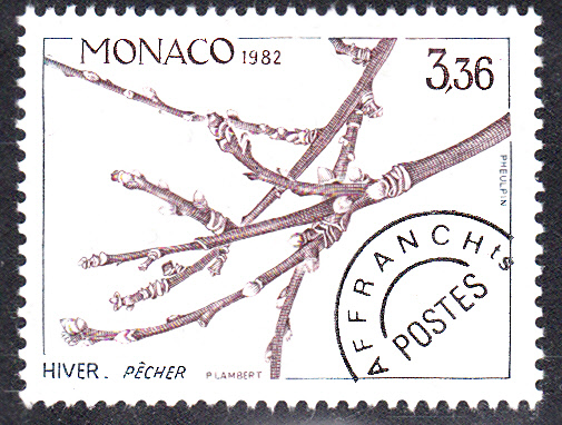 Diese Marke mit Vorausentwertung aus Monaco (MiNr 1519) zeigt einen Zweig eines Pfirsichbaumes (Prunus persica) im Winter.
