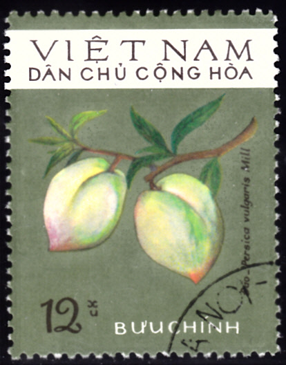 Aus Vietnam kommt diese Marke (MiNr 804) mit einem Zweig mit Pfirsichen (Prunus persica).