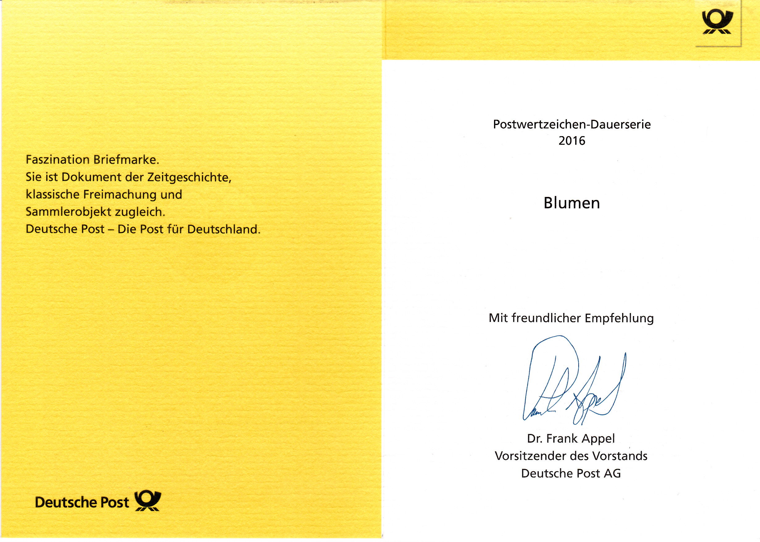 Klappkarte vom Vorsitzenden des Vorstands der Deutschen Post AG mit der Marke der Dauerserie "Blumen" (MiNr 3199) mit der Blüte einer Madonnenlilie (Lilium candidum) mit dem Ersttagsonderstempel aus Bonn.