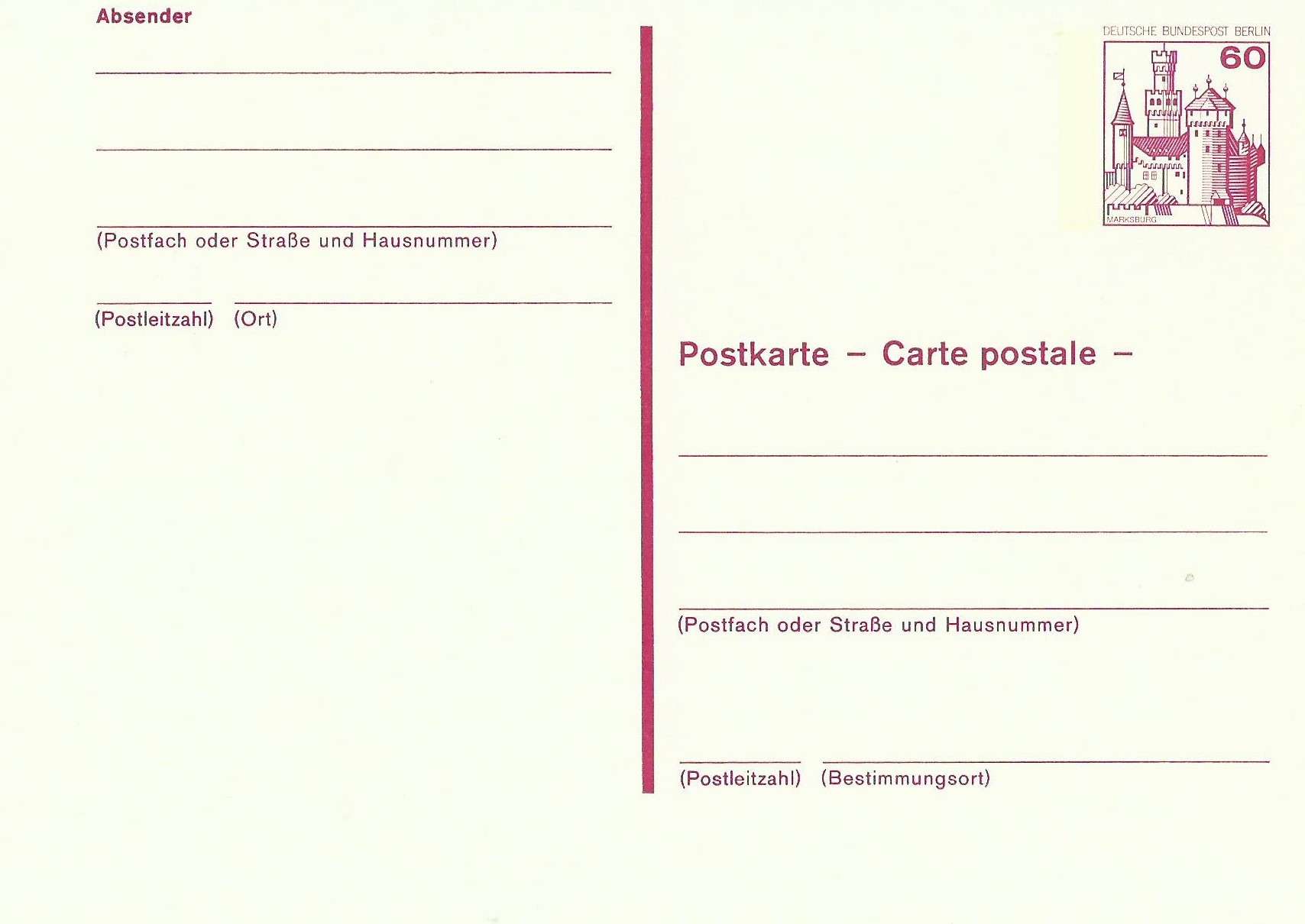 Hier eine Postkarte zu 60 Pf (MiNr P 110) mit farblich abweichendem Wertstempel der Marksburg. Die Rollenmarke war ja bekanntlich in brauner Farbe gehalten. Da der zusätzliche Vermerk „Carte postale“ mit aufgedruckt wurde, war sie für den Auslandsverkehr vorgesehen.