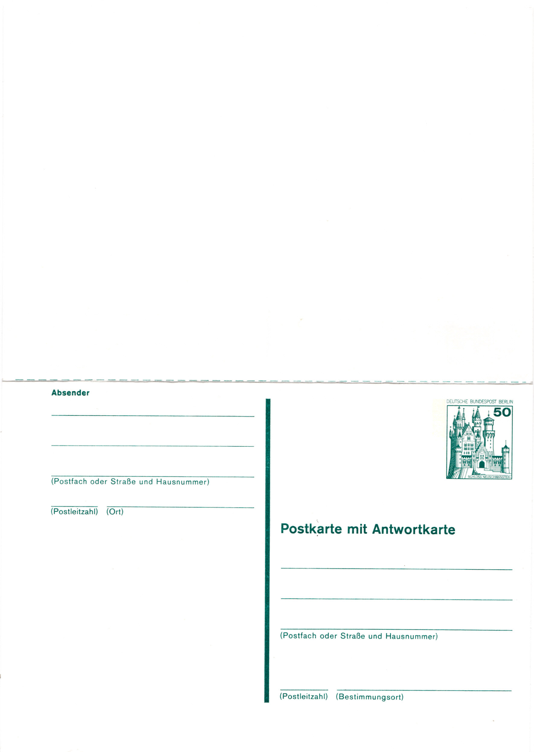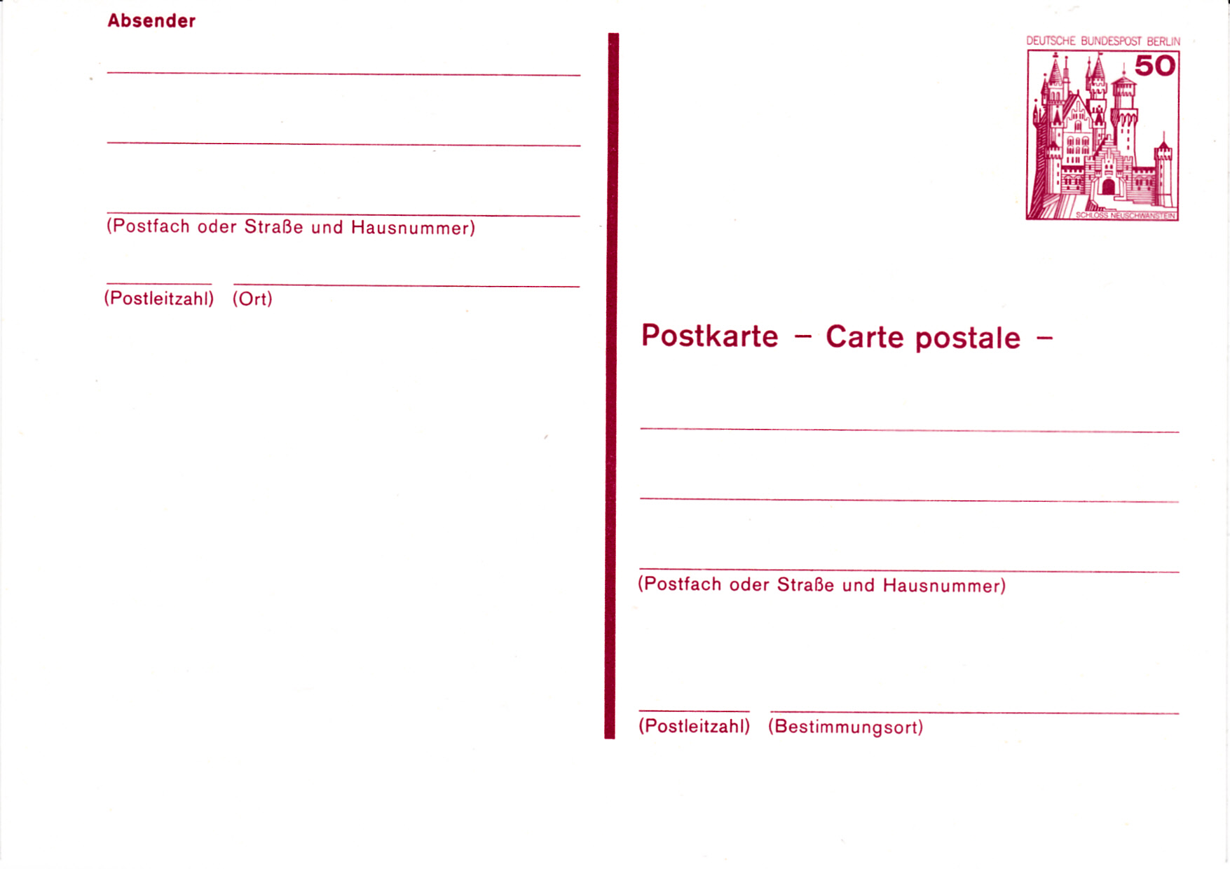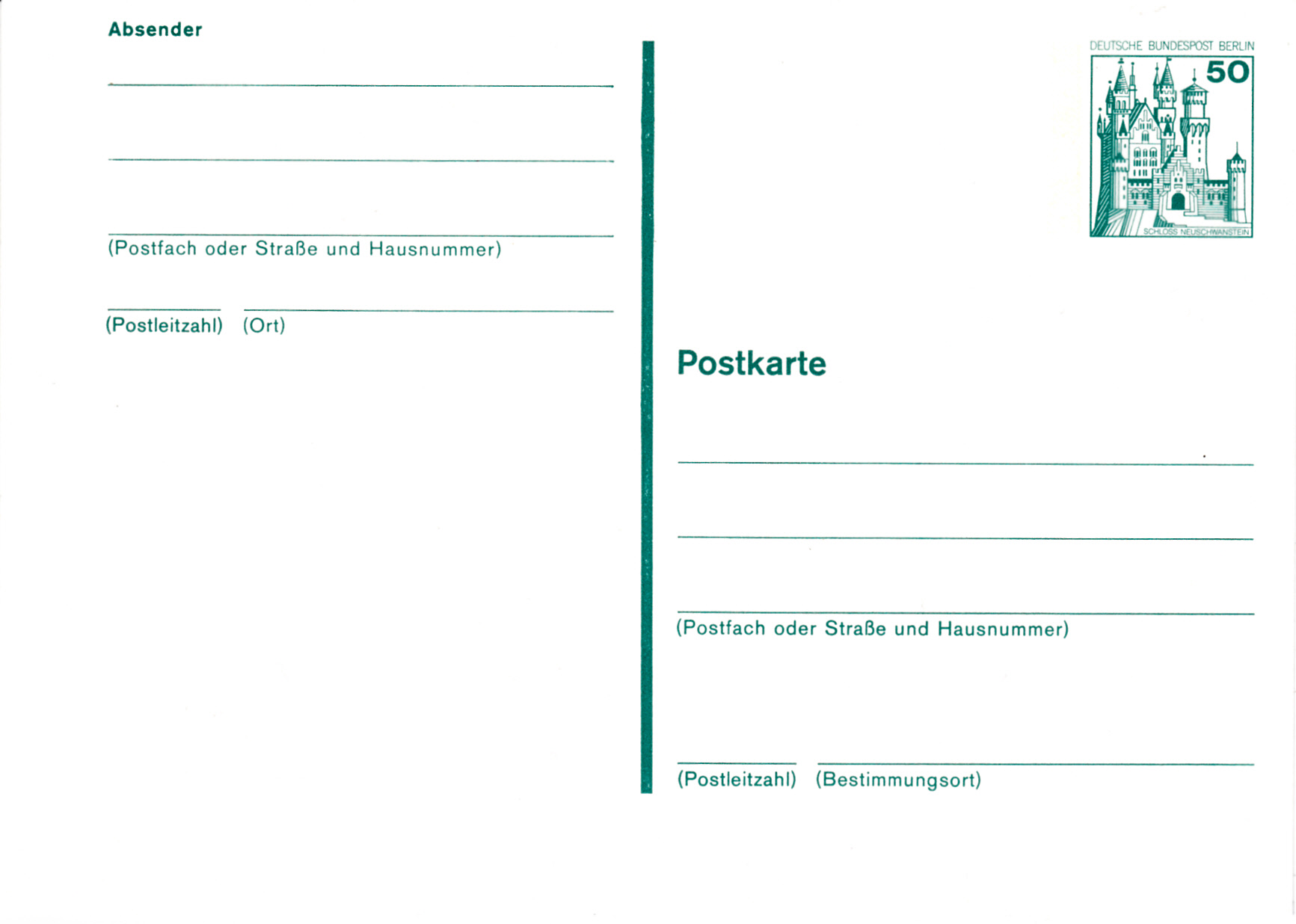 nach dem 1.1.1979 kostete die Postkarte im Fernverkehr 50Pf. Deshalb erschien eine Postkarte zu 50Pf mit dem Motiv Schloss Neuschwanstein in blaugrün. Die hier gezeigte Karten hat Strichlinien (P 109).