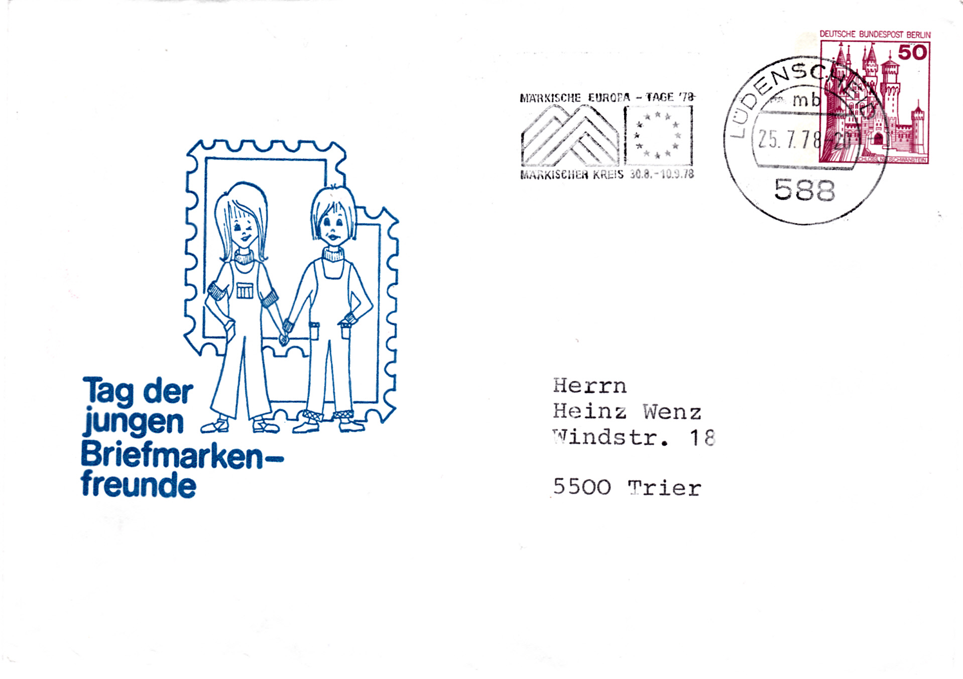 Privatganzsachenumschlag der Deutschen Philatelisten Jugend e.V. zum Tag der Jungen Briefmarkenfreunde mit Wertstempel zu 50Pf Schloss Neuschwanstein verwendet für eine Standardbrief von Lüdenscheid nach Trier.