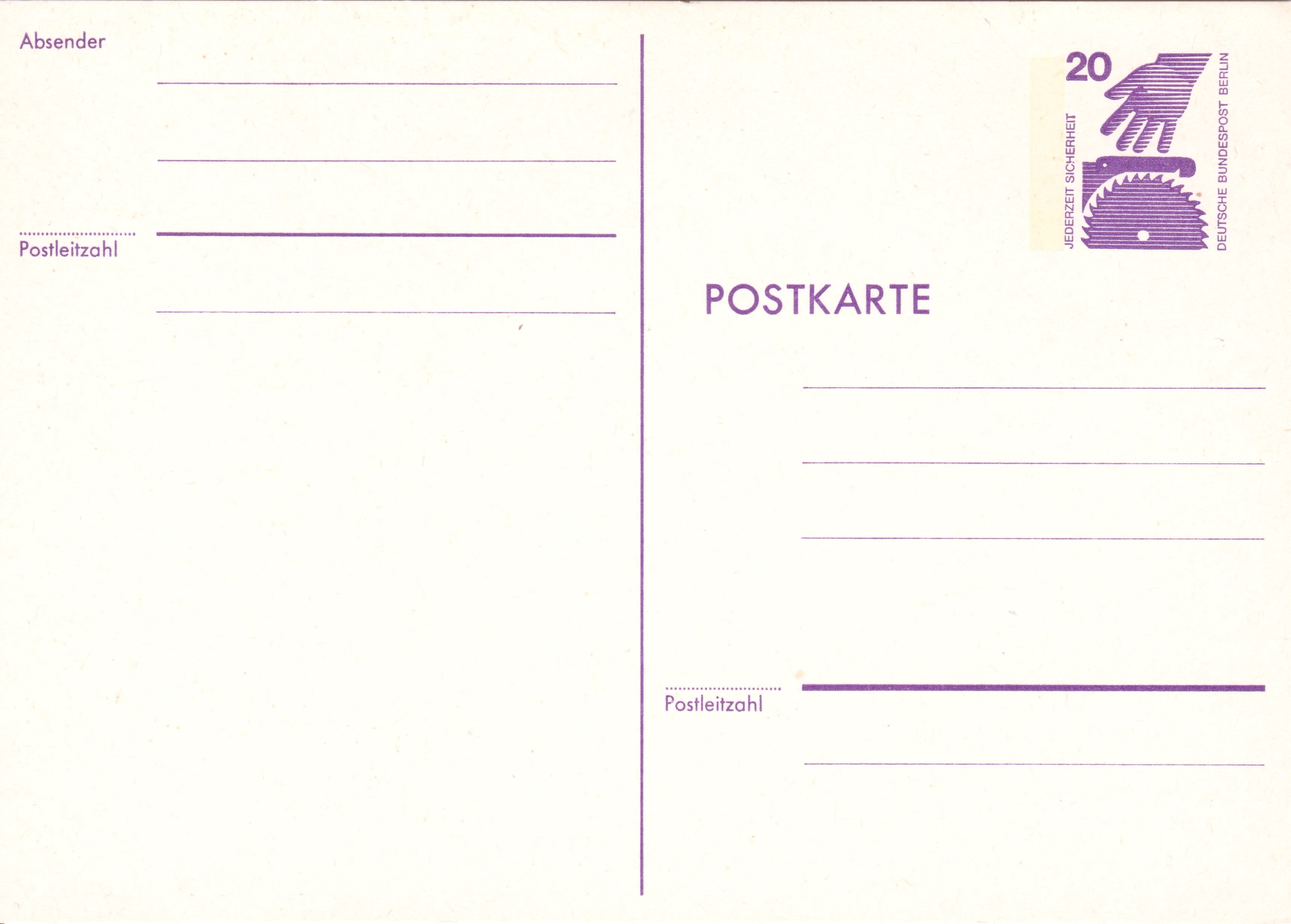 von der Serie Unfallverhütung sind auch Ganzsachen mit eingedruckten Markenmotiven erschienen. Hier kann ich eine ungebrauchte Postkarte zu 50 Pf (MiNr P 100) mit dem entsprechenden Wertstempel zeigen. Da der zusätzliche Vermerk „Carte postale“ mit aufgedruckt wurde, war sie für den Auslandsverkehr vorgesehen.