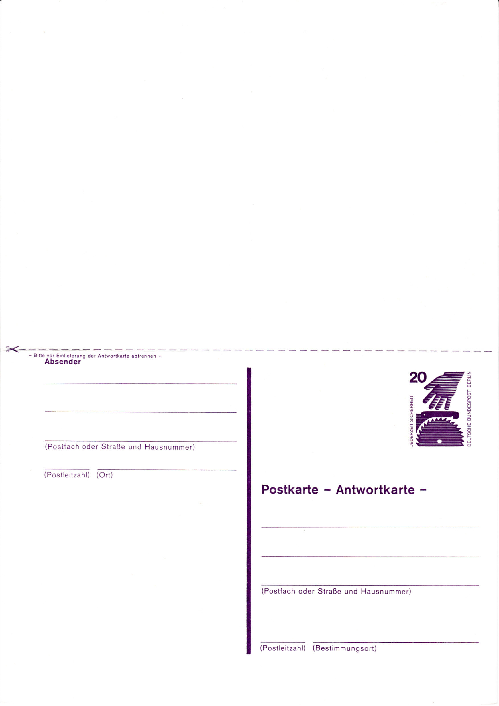 Es gibt diese Postkarten auch mit Antwortkarte. Hier die Karte für den Ortsverkehr (MiNr P 101).