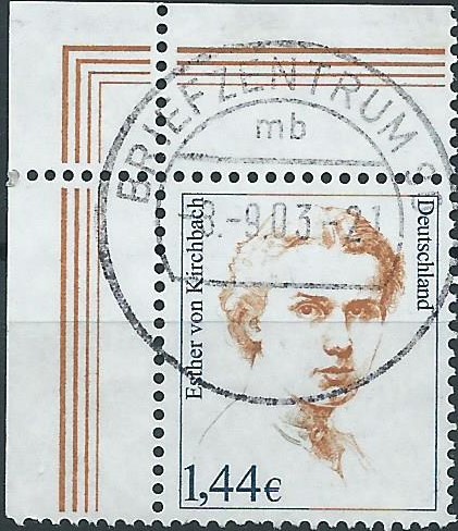 Der Wert zu 100 ct aus der linken oberen Ecke vom 10-er-Bogen, er wurde am 24.11.03 im Briefzentrum 85 gestempelt.