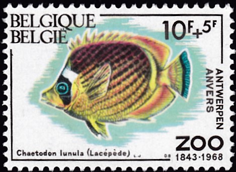In der gleichen Markenserie aus Belgien zum Jubiläum "125 Jahre Zoo Antwerpen" erschien auch eine Marke (MiNr 1530) mit einem Mondsichel-Falterfisch (Chaetodon lunula). Bei Michel wird er Sichelbinden-Falterfisch (Chaetodon lunula) ) genannt.