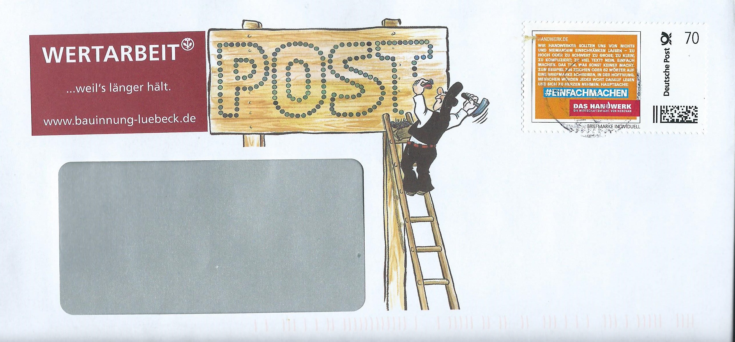 ein Neuzugang der Marke Individuell zu 70 Cent, ein neues Motiv der Handwerk-Serie „#einfach machen“. Leider ist der Stempel unleserlich, aber das Motiv wird hier schon einmal verewigt: