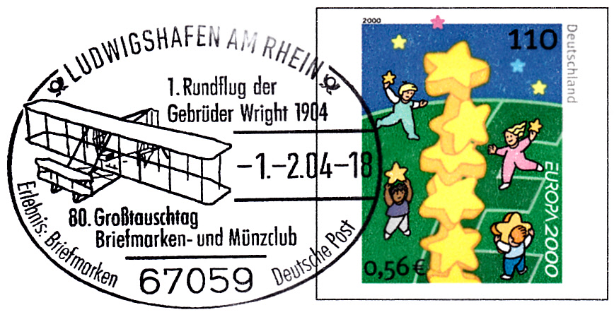 Sonderstempel vom 1.2.2004 aus Ludwigshafen mit einer Abbildung des "Wright Flyer" der Gebrüder Wright auf einem Plusbrief (MiNr USo 20 I).