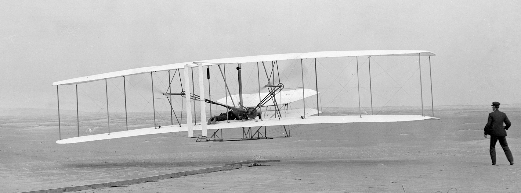 Den ersten erfolgreichen Flug mit dem Doppeldecker-Propellerflugzeug "Wright Flyer" führten die Gebrüder Wright am 17.12.1903 durch. The Maschine mit Orville Wright am Steuer blieb dabei in Kitty Hawk, North Carolina, für 12 Sekunden in der Luft und legte 120 Fuß zurück: