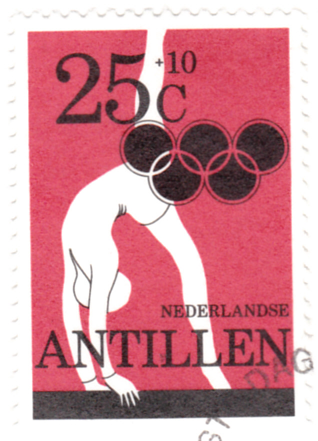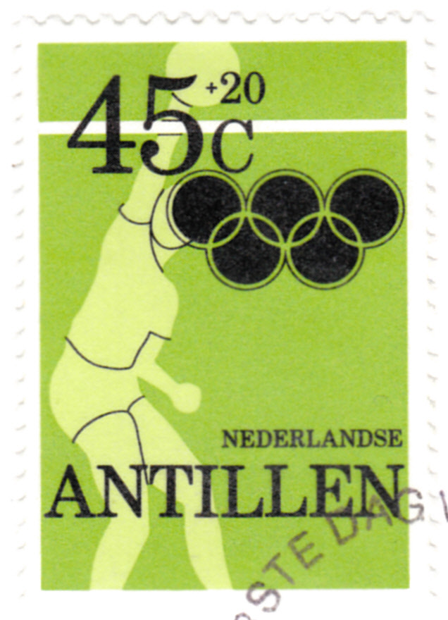 Auf den Niederländischen Antillen sind ebenfalls Marken zu den Sommerspielen in Moskau erschienen. Hier die Marke zu 25+10 Cent (MiNr 425 A) mit einer Darstellung einer Turnerin am Schwebebalken.