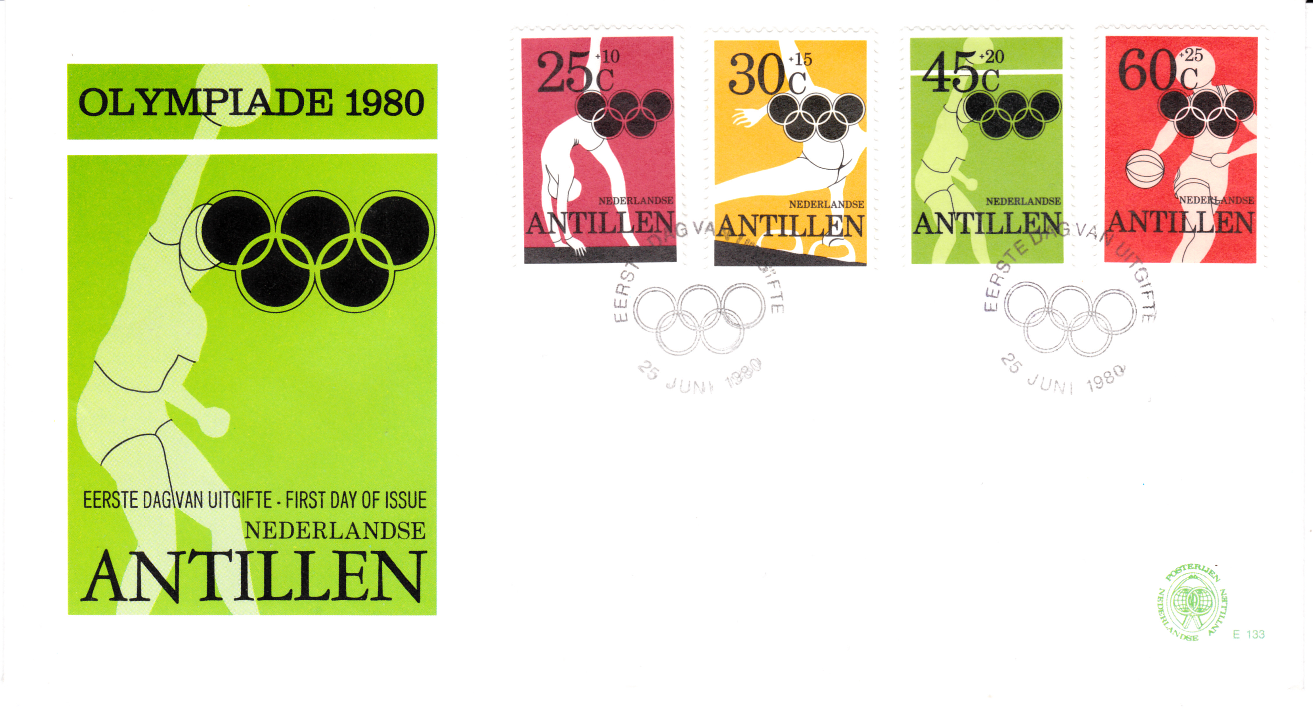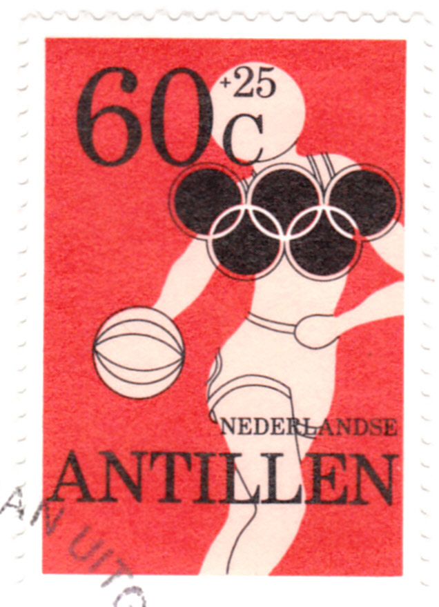 Auf den Niederländischen Antillen sind ebenfalls Marken zu den Sommerspielen in Moskau erschienen. Hier die Marke zu 25+10 Cent (MiNr 425 A) mit einer Darstellung einer Turnerin am Schwebebalken.