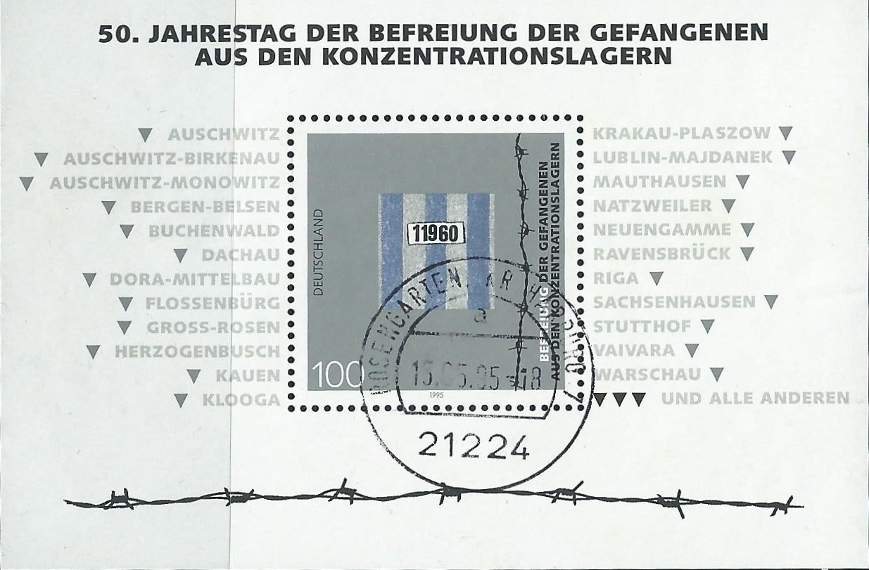 Ebenfalls am 5.5.1995 erschien Block 32 zum Thema „50. Jahrestag der Befreiung der Gefangenen aus den Konzentrationslagern“. Das Markenmotiv der Marke zu 100 Pf zeigt einen Teil der Häftlingskleidung und Stacheldraht. Im Blockrand sind die Namen der Konzentrationslager aufgeführt. Gestempelt wurde der Block am 15.5.95 in Rosengarten Kreis Harburg.