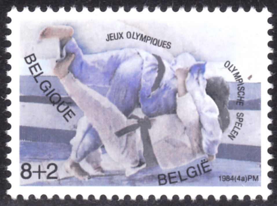 Aus Belgien kommt diese Marke (MiNr 2171) zu den Olympischen Spielen 1984 mit einer Kampfszene beim Judo.