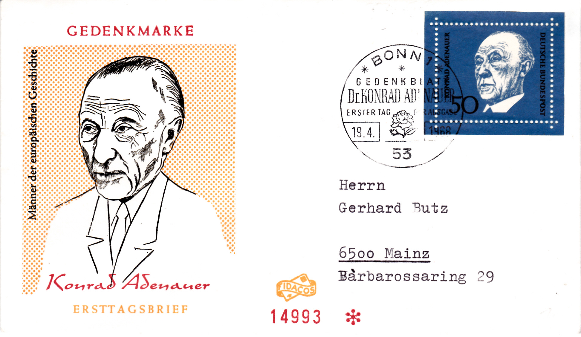 Dazu noch eine Ersttagskarte: Die Michel-Nummer 537 zum 1. Todestag Konrad Adenauer. Gestempelt wurde hier mit dem Ersttagssondestempel Bonn vom 19.7.68.