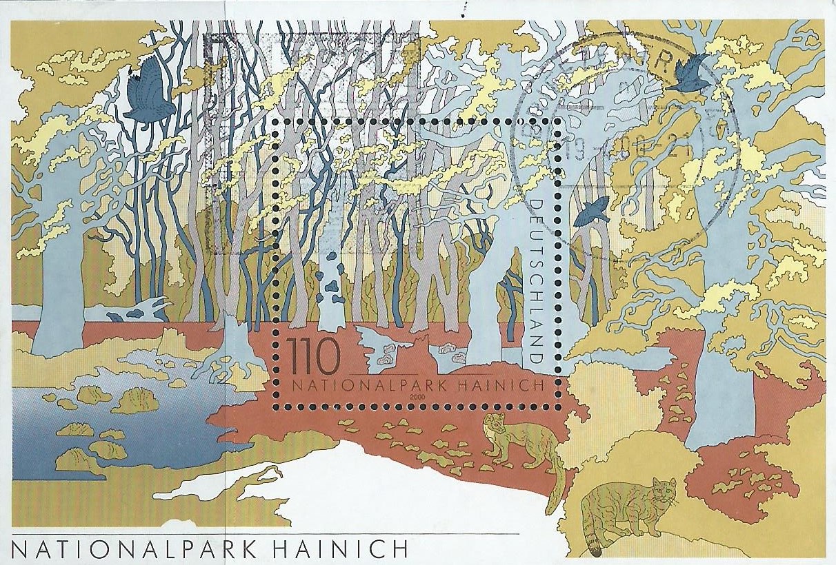Block 56 erschien am 8.11.2001. Er ist ein ganz besonderer Block, er enthält neben 2 Werten der Deutschen Post auch 2 Werte der Spanischen Post mit identischen Motiven. Links im Block sind die beiden deutschen Werte zu 100 + 50 Pf (0,56 + 0,26€) und 110 + 50 Pf (0,56 + 0,26€) als senkrechter Zusammendruck enthalten, rechts die beiden spanischen Werte. Die Marken waren nur in ihren jeweiligen aufgedruckten Ländern gültig, es mussten also 2 verschiedene Stempel darauf abgeschlagen werden. Viele Sammler versuchten seinerzeit den Block komplett in Deutschland stempeln zu lassen, aber der deutsche Stempel auf spanischen Marken, das geht gar nicht. Streng genommen würde ein Prüfer hier „Stempel falsch“ prüfen. Der hier gezeigte Block hat aber die richtigen Stempel, links den Ersttagssonderstempel Bonn und rechts den von Madrid. Theoretisch wäre es möglich gewesen, auch Tagesstempel aus beiden Ländern auf dem Block abschlagen zu lassen, aber ob das viele Sammler geschafft haben?