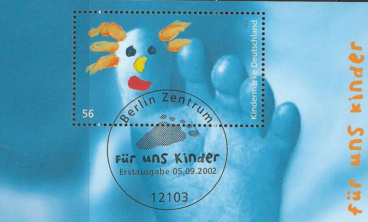 Und noch einer „Für uns Kinder“: Am 5.9.2002 wurde der Block 60 zum Preis von 56 Cent verausgabt und hat als Motiv den Fuß eines Kleinkindes mit „Zehfigur“. Auch hier wurde wieder mit dem Ersttagssonderstempel von Berlin-Zentrum gestempelt.