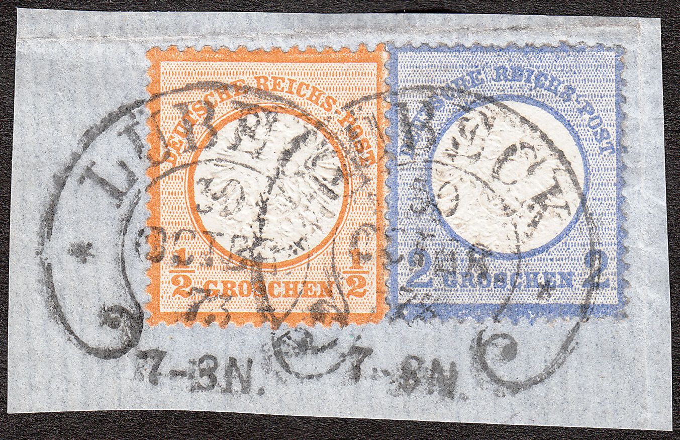 MiNr. 18 sowie MiNr. 20 auf Briefstück, entwertet am 30.10.1873 per Hufeisenstempel LÜBECK: