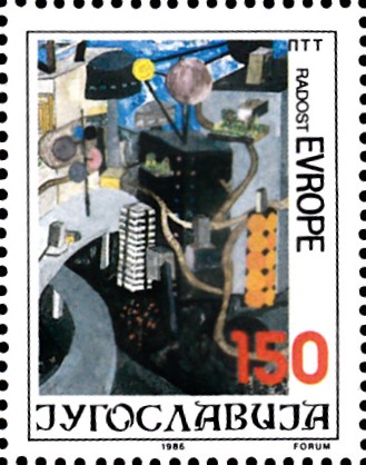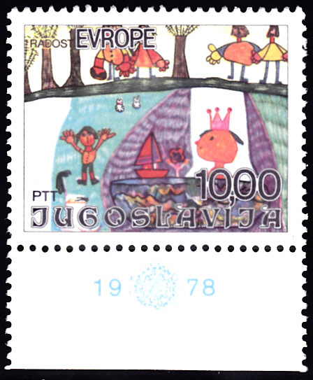Auf der Marke aus Jugoslawien (MiNr 2194) zum Europäischen Kindertreffen "Freude Europas" im Jahre 1986 zeigt die Kinderzeichnung "Friedenstaube, Kind auf Weltkugel" von Tanja Faletic (14 J.).