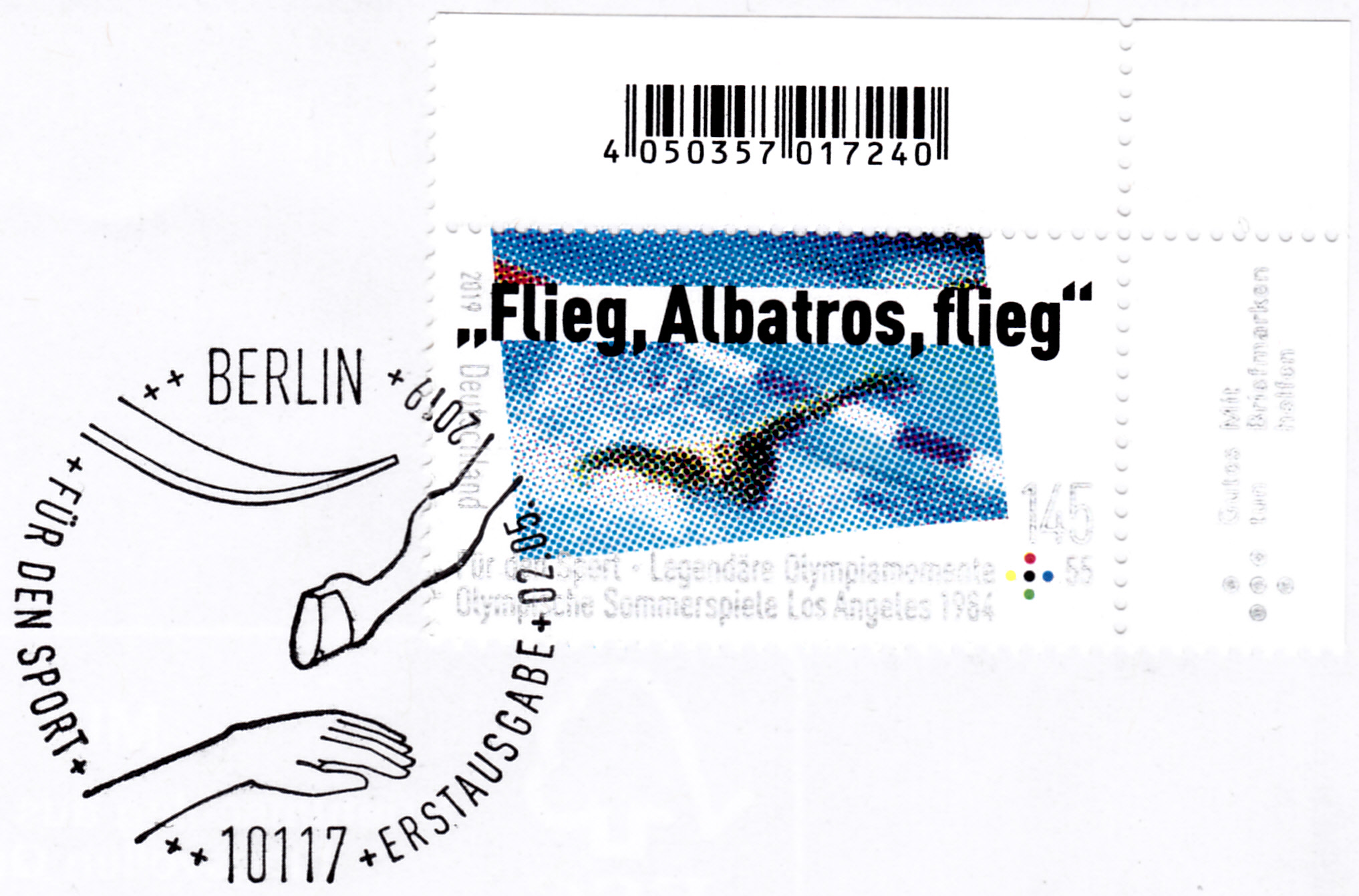 Die Marke zu 145+55 Cent (MiNr 3462) aus der Serie "Für den Sport" 2019 erinnert an diesen Ausruf und zeigt undeutlich Michael Groß.