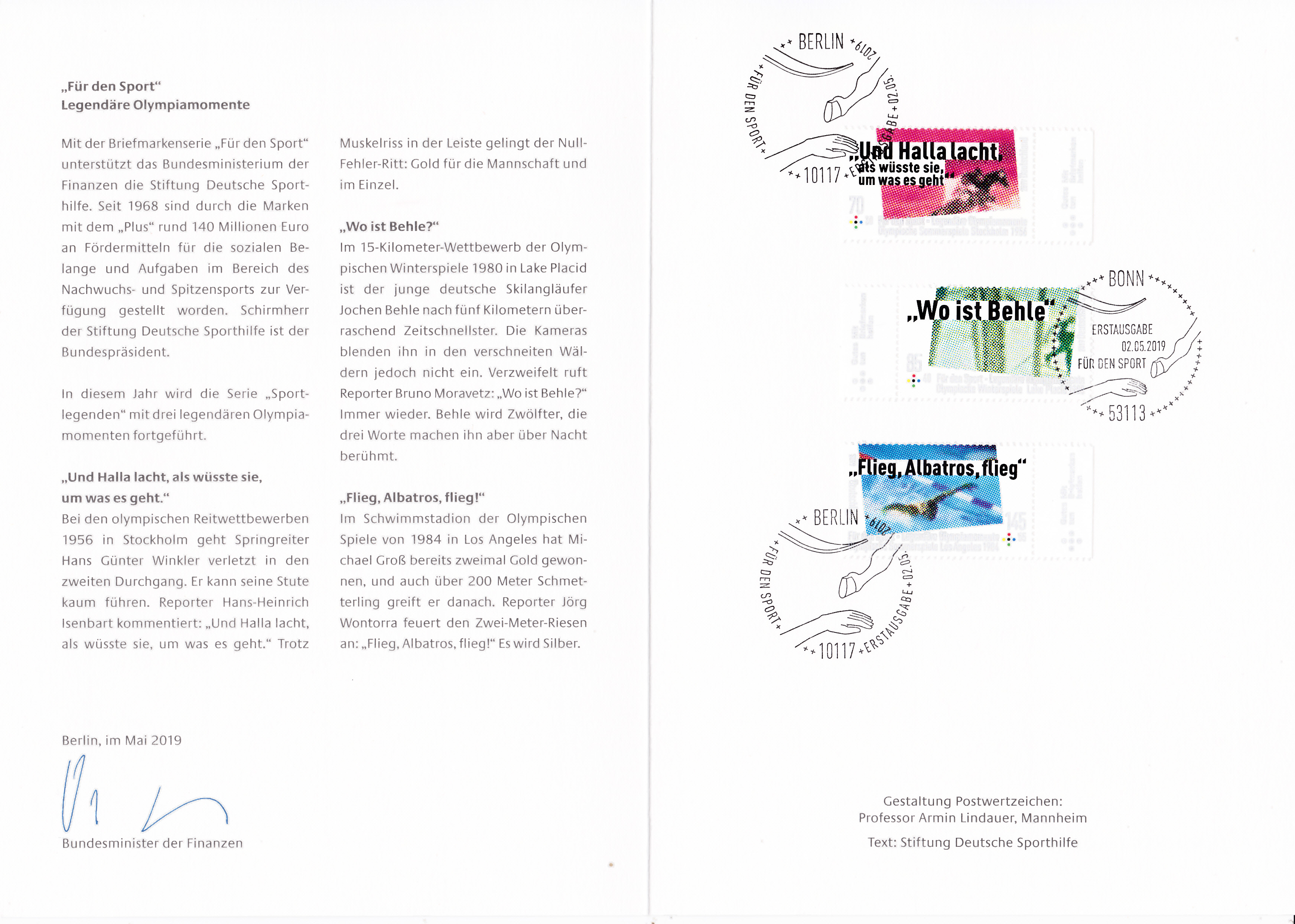 Ministerkarte des Finanzministers mit den drei Marken "Für den Sport" 2019 (MiNr 3460 bis 3462) mit Motiven zu "Legendären Olympiamomente" und den beiden Ersttagsonderstempel Bonn und Berlin.