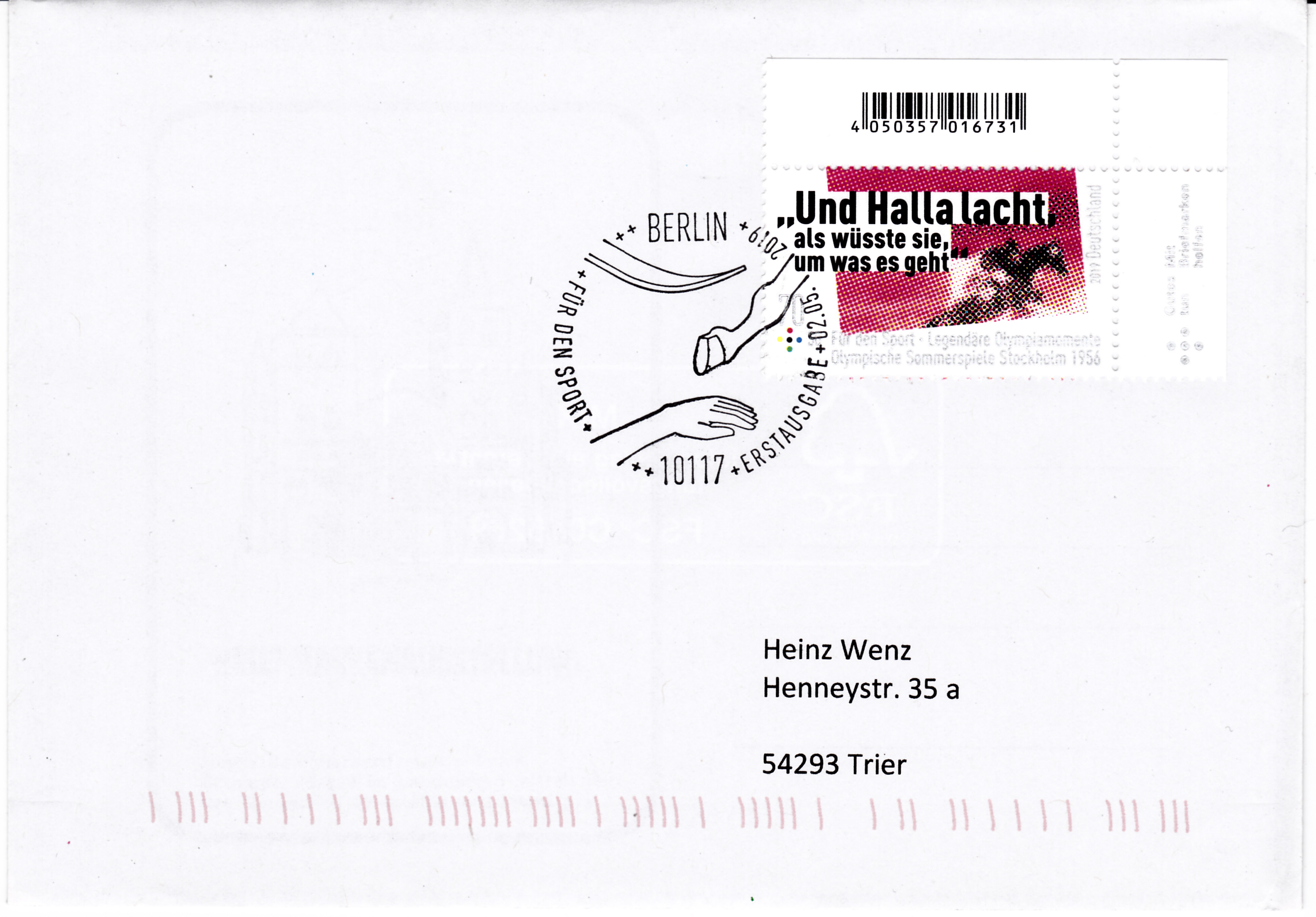 Auf der Marke "Für den Sport" 2019 zu 70+30 Cent (MiNr 3460) wird an den Ausspruch "und Halla lacht, als wüsste sie, um was es geht." des Reporters Hans-Heinrich Isenbarth erinnert.