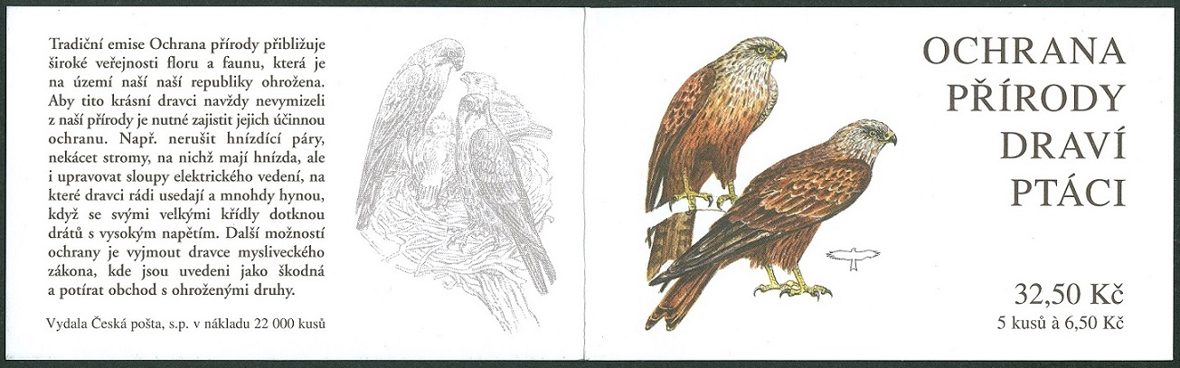 Die Post der tschechischen Republik gab dieses Markenheftchen heraus, eines einer Kleinserie von 3 Markenheftchen mit Greifvogelmotiven, in dem sich 5 Werte zu 6 Kronen 50 (Heller) mit diesem Rotmilan-Motiv befinden.