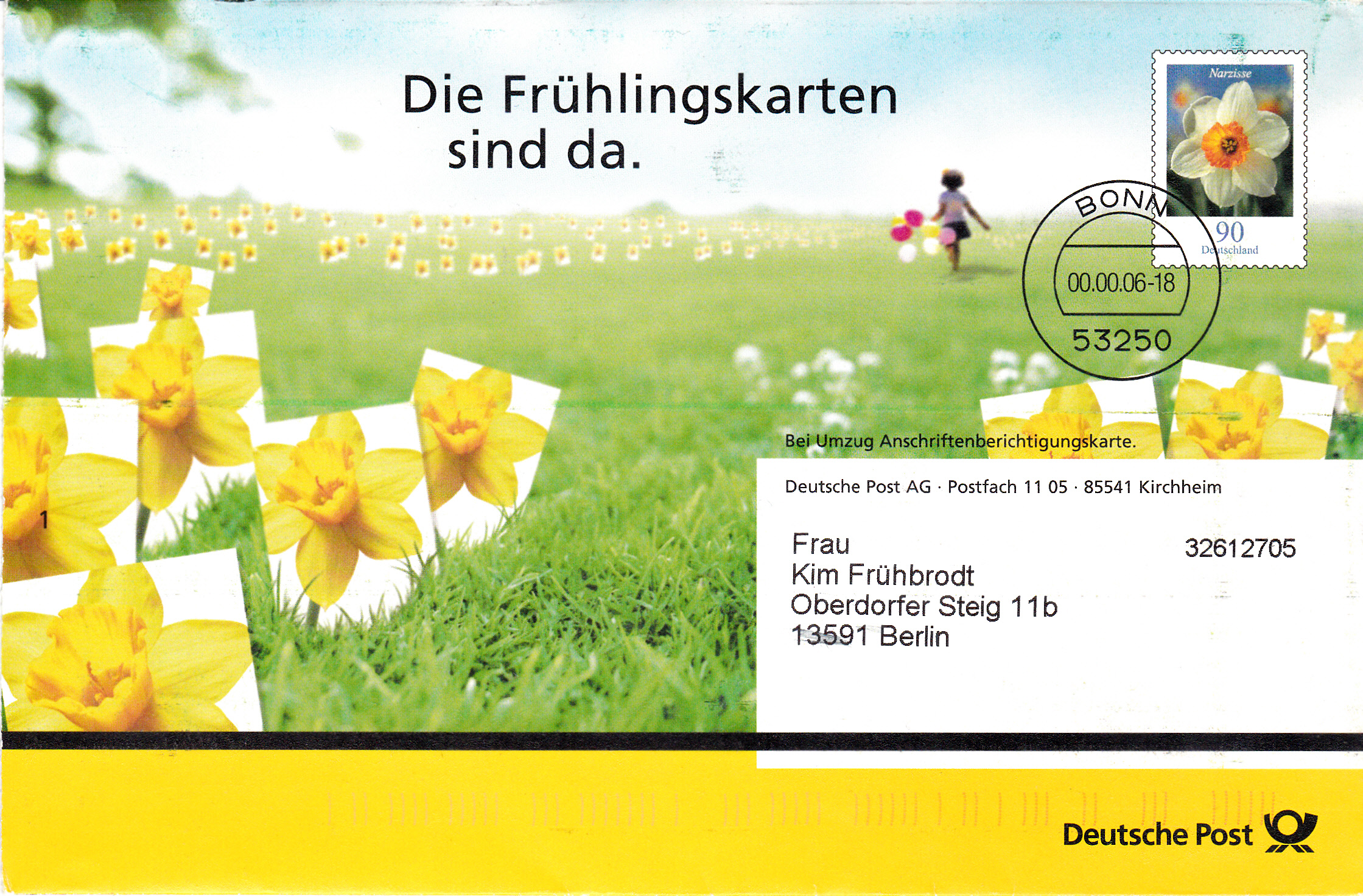 Dieser Faltbrief im Format 190 x 125 mm, eine Eigenausgaben der Deutschen Post AG - Postlogo "Deutsche Post" (MiNr EA B62), hat einen Wertstempel mit der 90 Cent Marke (MiNr 2506) "Narzisse (Narcissus sp.) " aus der Bauerserie "Blumen".