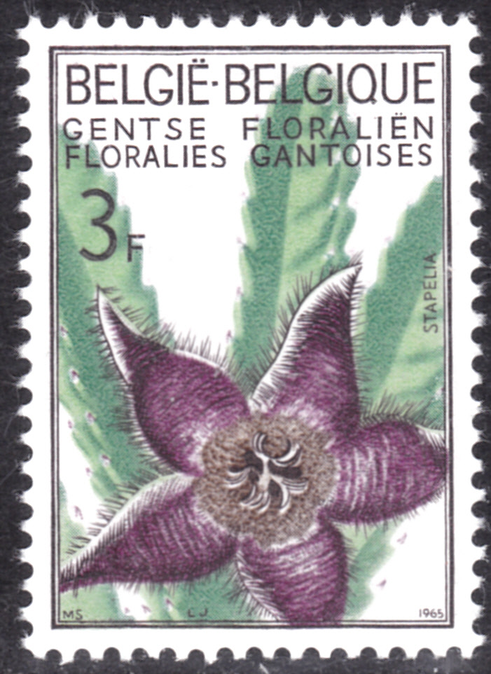 Diese Marke aus Belgien (MiNr 1377 I) zur Genter Blumenschau 1965 zeigt eine Stapelia hirsuta. Michel nennt als Name Rauhhaarige Aasblume (Stapelia hirsuta).