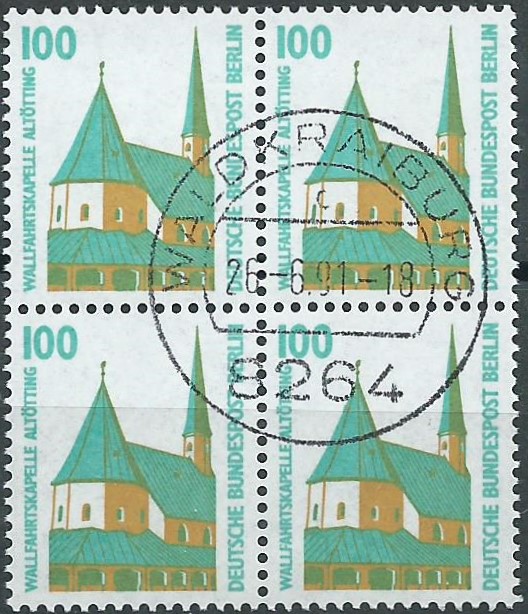 Mir ist es gelungen, von der Sehenswürdigkeiten 100 Pf Berlin eine Ganzfälschung zu erhalten. Ein Sammlerfreund hatte noch ein kleines Bogenteil übrig und mir vermacht. Im grossen Bild habe ich einmal eine echte Marke vom Eckrand zum Vergleich mit gezeigt. Da sieht man wunderbar die Unterschiede alleine schon in der Papierfarbe. Die Fälschung hat gelbliches Papier, das Original hell weisses. Und das Druckbild der Fälschung ist auch nicht so klar wie das Original. Seht selbst: