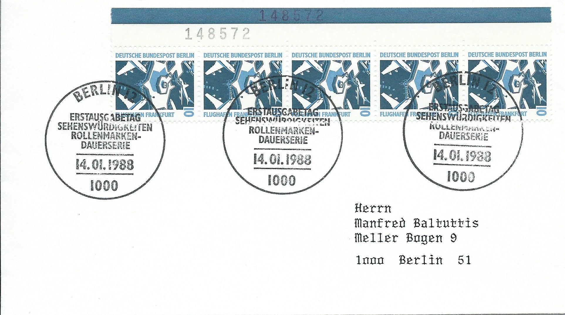 Weiterhin ein Beleg als Ortsbrief innerhalb Berlins gelaufen mit einem senkrechten 5-er-Streifen vom linken Bogenrand. Auf dem Rand sind noch die beiden Bogenzählnummern im Farbstreifen und im weissen Bogenrand zu sehen. Gestempelt wurde mit dem Ersttagsonderstempel von Berlin am 14.1.88.